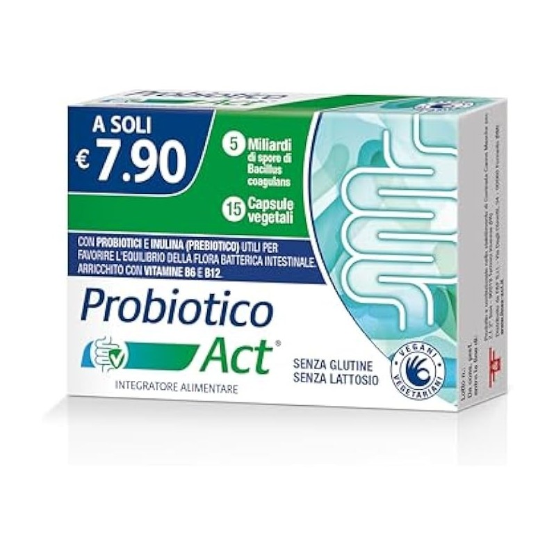 CHE COS'E' PROBIOTICO ACT? È un integratore alimentare a base di 5 miliardi di probiotici (spore di Bacillus coagulans), Inulina (prebiotico), Vitamina B6 e Vitamina B12; ALL'INTERNO DELLA CONFEZIONE: la confezione contiene 15 pratiche capsule. SENZA GLUTINE e SENZA LATTOSIO; QUANDO UTILIZZARLO: Si consiglia di assumere 1 capsula al giorno, con acqua, preferibilmente lontano dai pasti; BENEFICI: Il Bacillus coagulans e l’Inulina favoriscono l’equilibrio della flora batterica intestinale. Le Vitamine B6 e B12 riducono stanchezza e affaticamento; INGREDIENTI: Inulina; Agente di carica: cellulosa microcristallina; Idrossipropilmetilcellulosa; Bacillus coagulans; amido di mais, biossido di silicio; Vitamina B6, Vitamina B12; ›